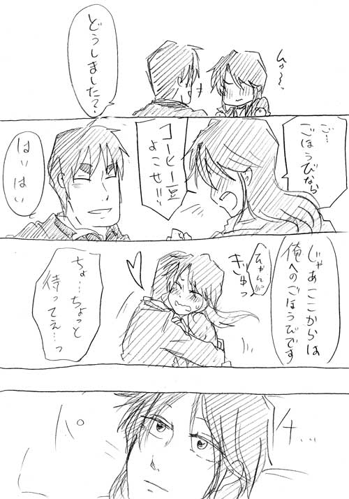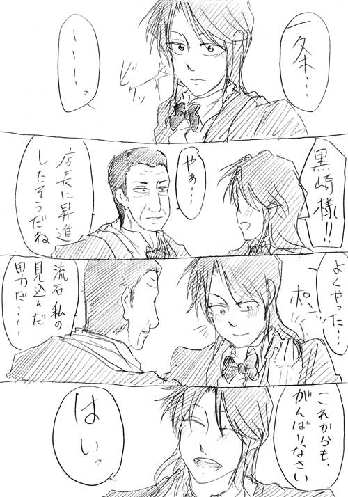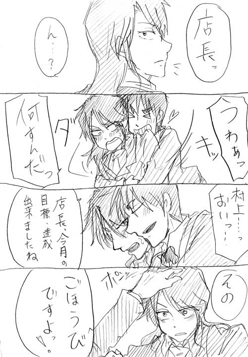 7000hitのリクエスト『(黒崎、村上、カイジのいずれかに)甘やかされて幸せそうな店長』の漫画です。